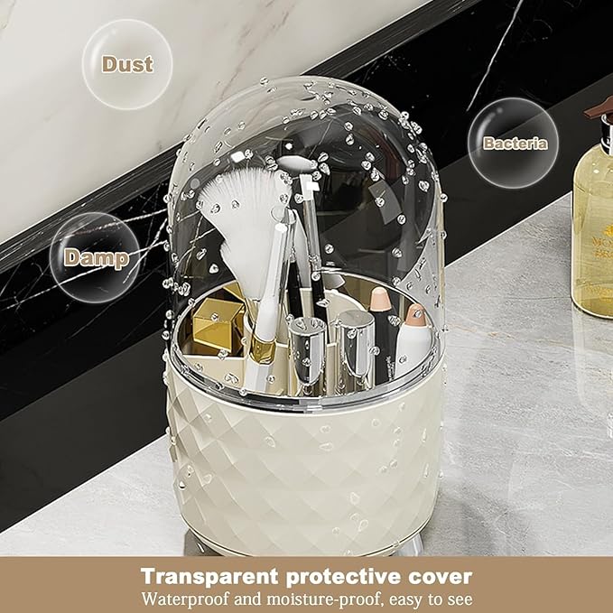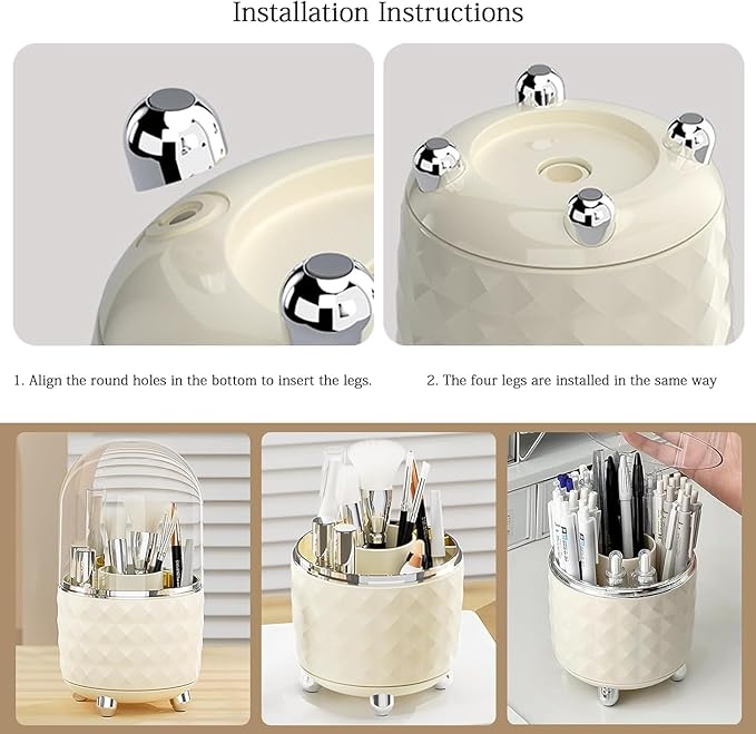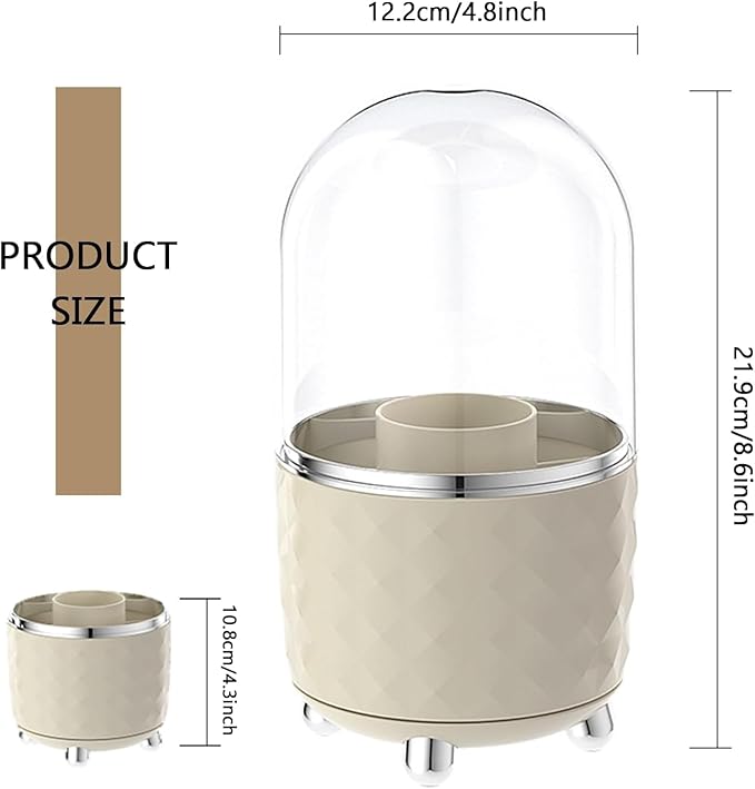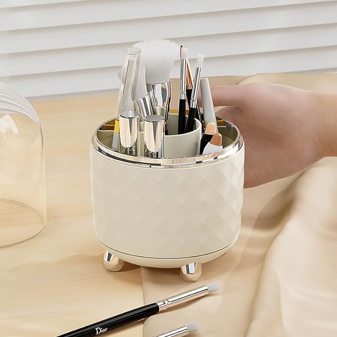 Stylish Storage: This acrylic makeup brush holder features a rotating lid and divided interior for neatly organizing all of your brushes and cosmetics in one place.